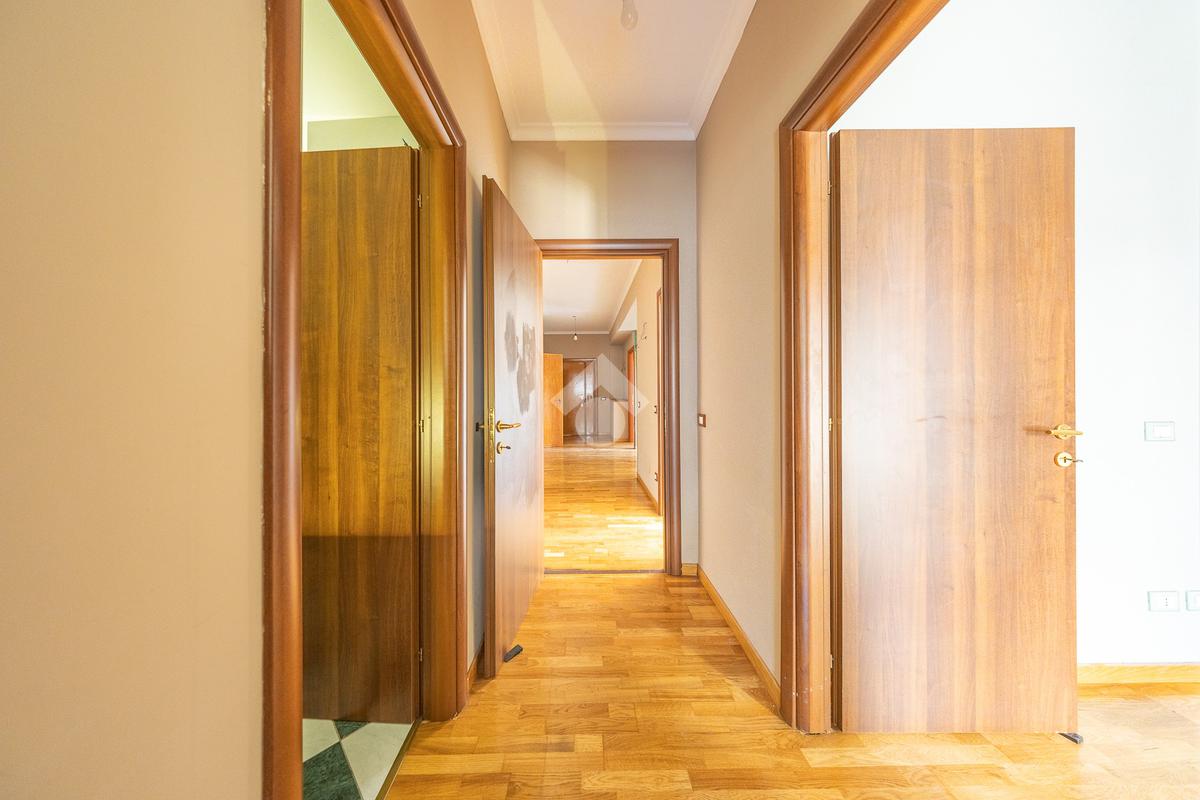 L’appartamento è rifinito con parquet in tutti gli ambienti, ad eccezione dei bagni, ed è inoltre dotato di tende da sole, grate di sicurezza, zanzariere e comodi armadi a muro.
