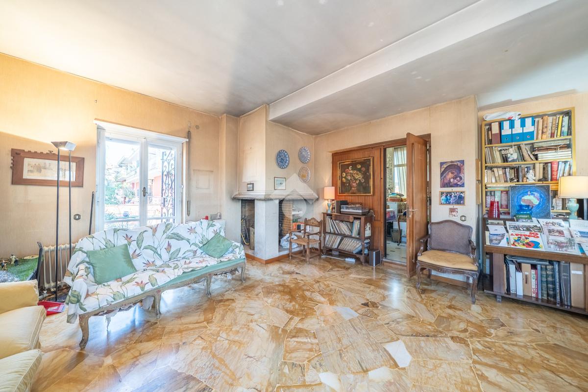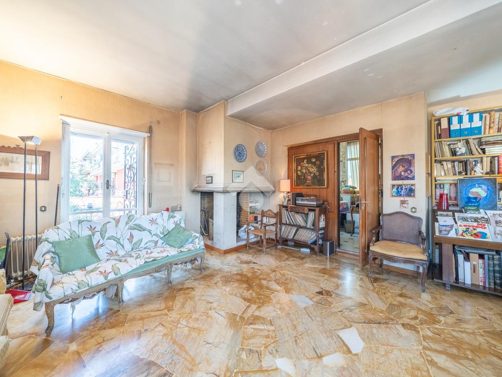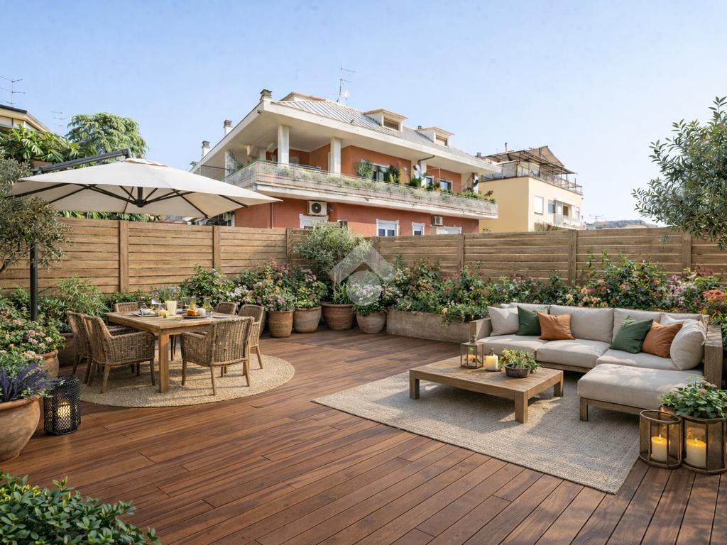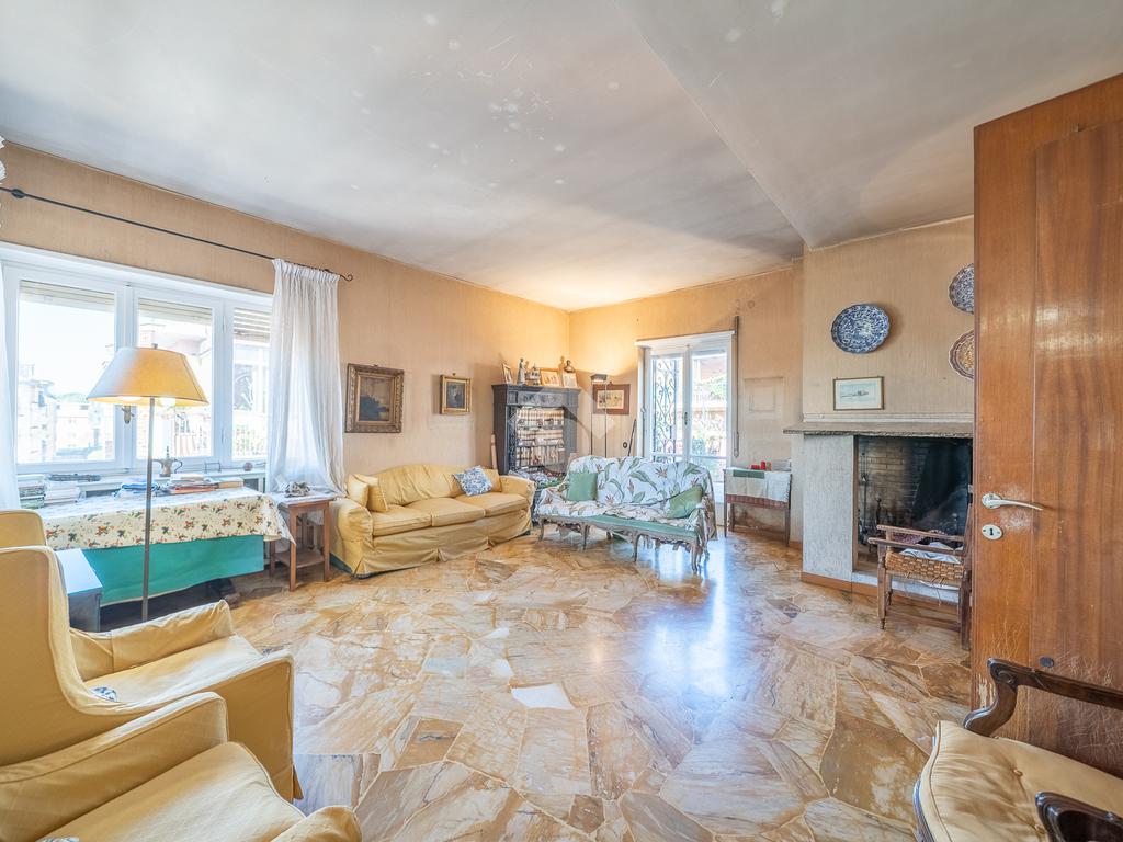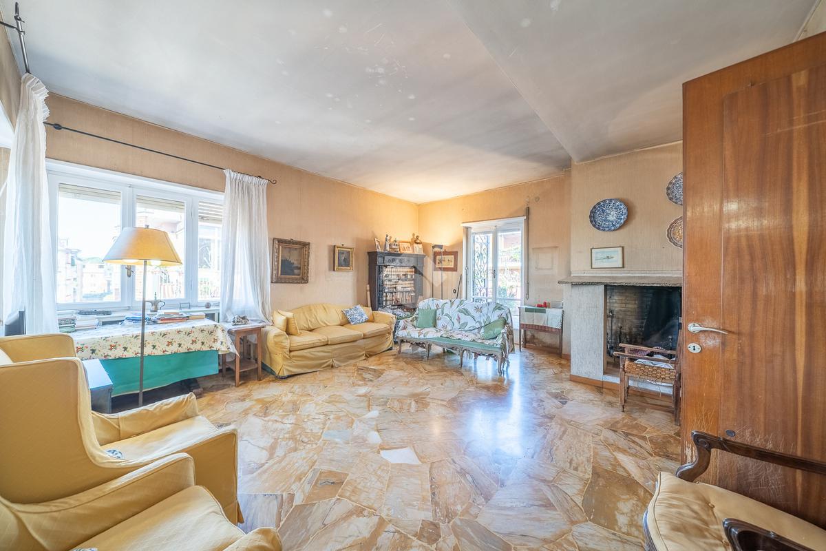 La zona giorno si compone di doppio ingresso ed ampio salone impreziosito dalla presenza di un camino, con accesso diretto ad uno splendido terrazzo di circa 60 m², ideale per momenti di relax e convivialità.